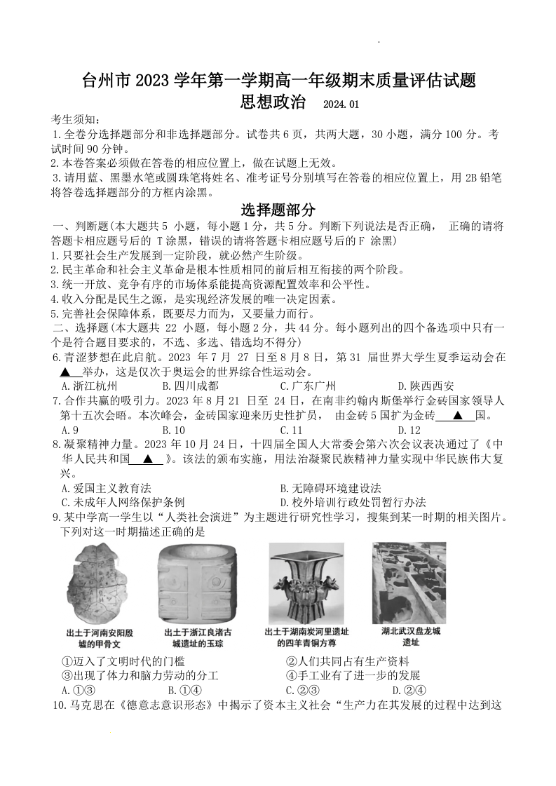 浙江省台州市2023-2024学年高一上学期1月期末考试政治