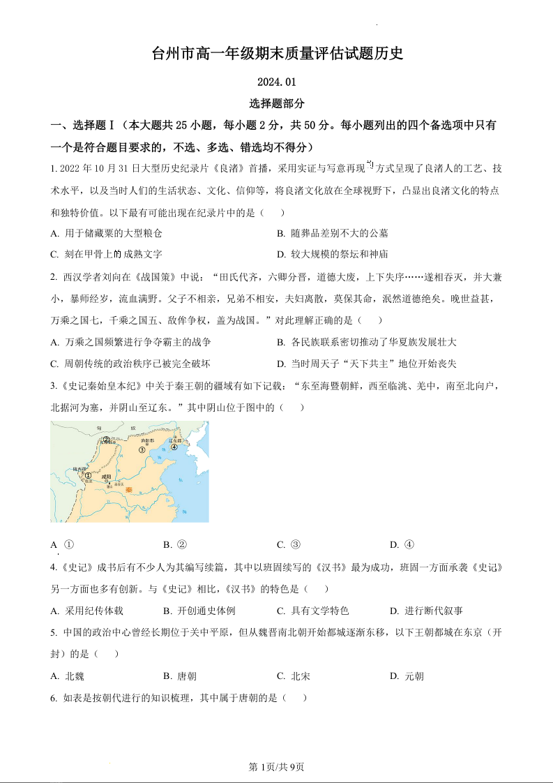 浙江省台州市2023-2024学年高一上学期1月期末考试历史(原卷版)