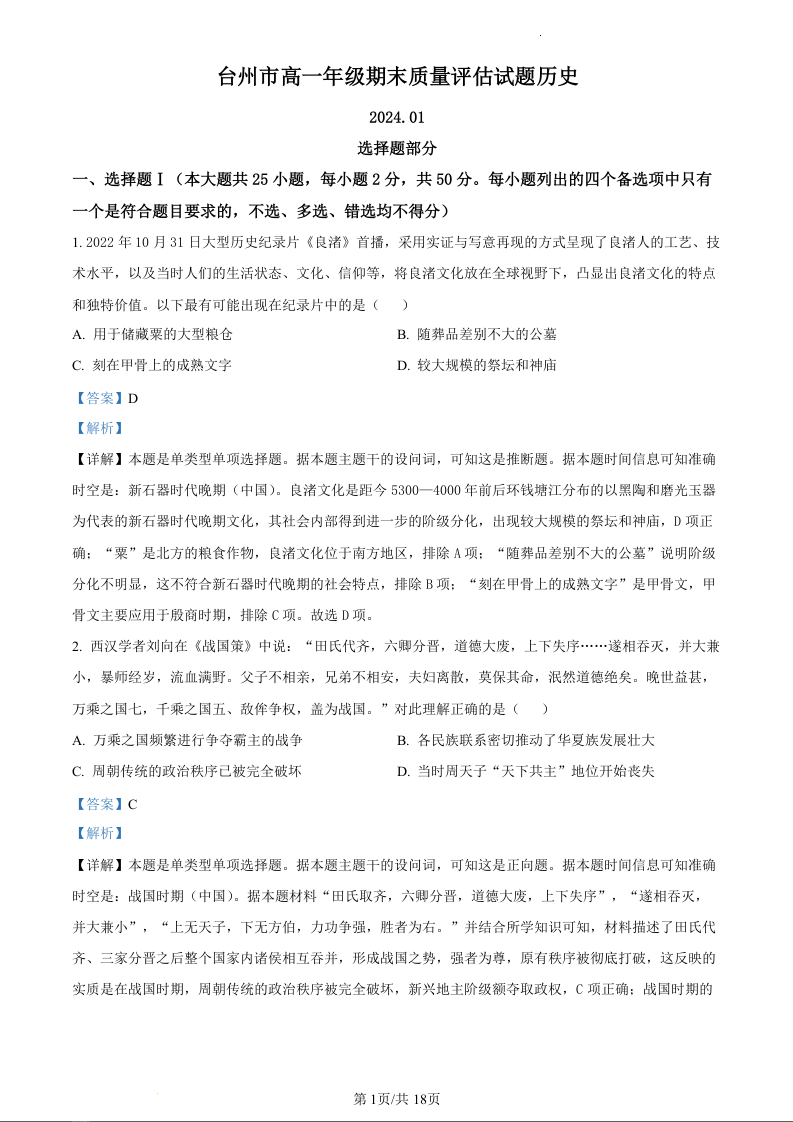 浙江省台州市2023-2024学年高一上学期1月期末考试历史(精品解析版)