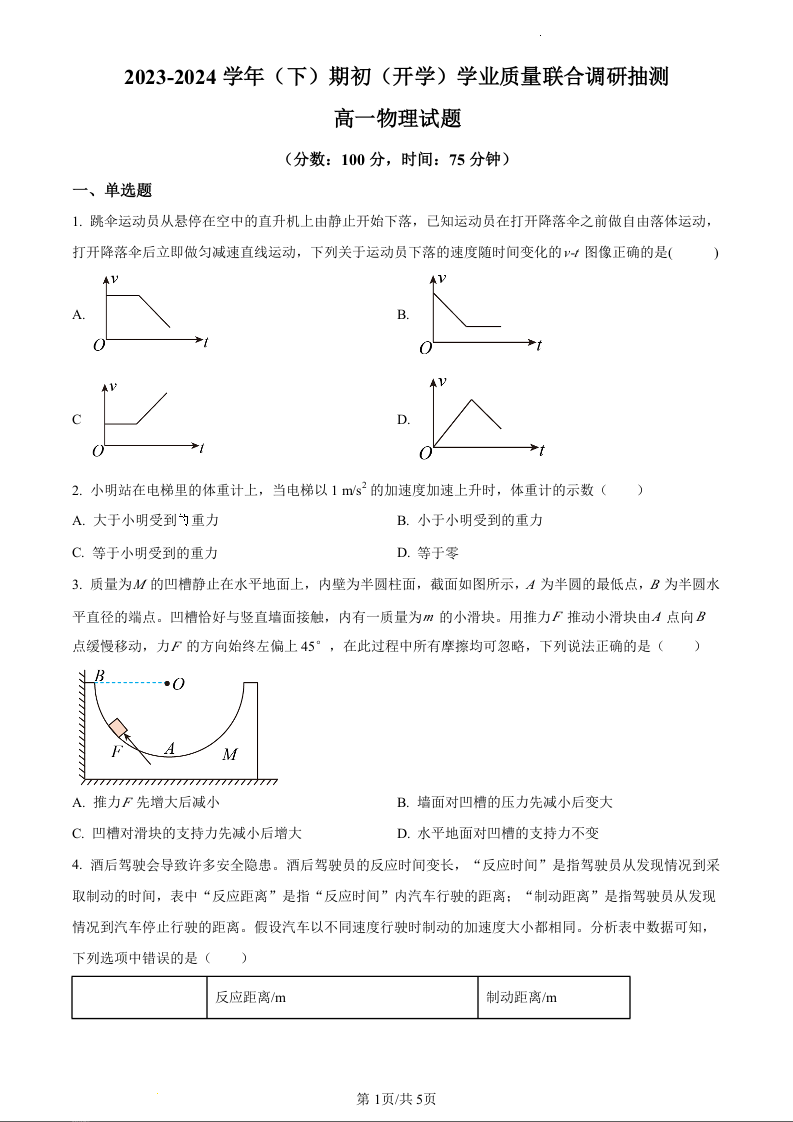 重庆市乌江新高考协作体2023-2024学年高一下学期开学学业质量联合调研抽测物理(原卷版)