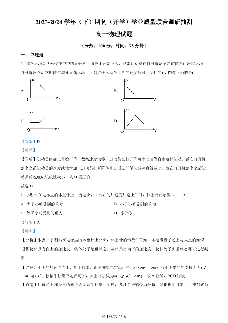 重庆市乌江新高考协作体2023-2024学年高一下学期开学学业质量联合调研抽测物理(精品解析版)