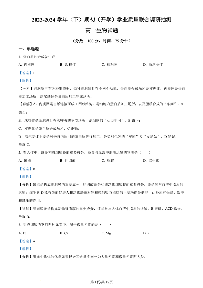 重庆市乌江新高考协作体2023-2024学年高一下学期开学学业质量联合调研抽测生物(精品解析版)