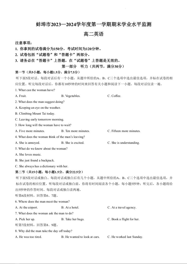 安徽省蚌埠市2023-2024学年高二上学期期末考试英语+答案