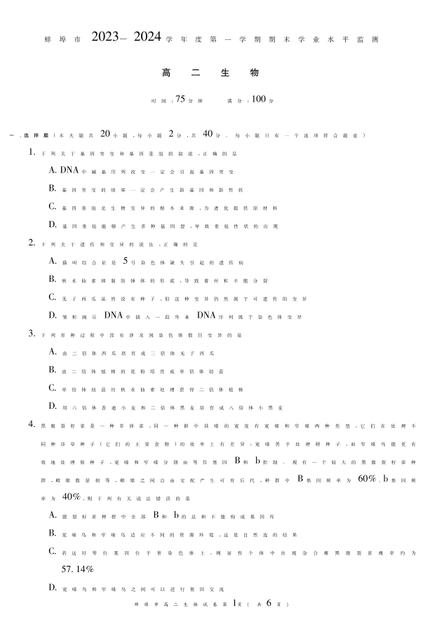 安徽省蚌埠市2023-2024学年高二上学期期末考试生物