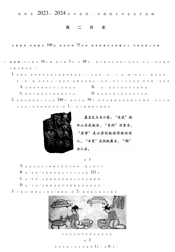 安徽省蚌埠市2023-2024学年高二上学期期末考试历史