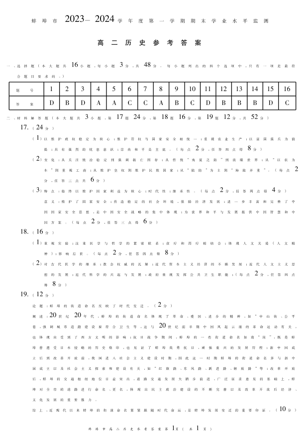 安徽省蚌埠市2023-2024学年高二上学期期末考试历史答案