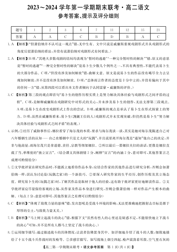 安徽省滁州市2023-2024学年高二上学期期末考试语文答案