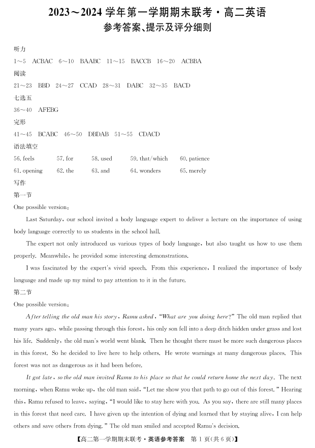 安徽省滁州市2023-2024学年高二上学期期末考试英语答案