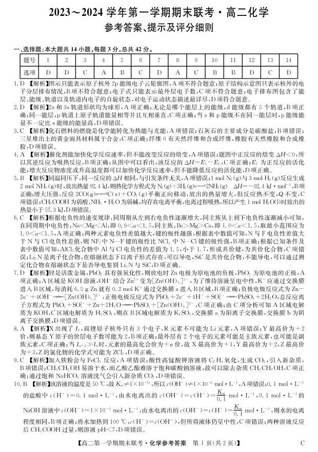 安徽省滁州市2023-2024学年高二上学期期末考试化学答案