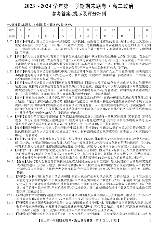 安徽省滁州市2023-2024学年高二上学期期末考试政治答案