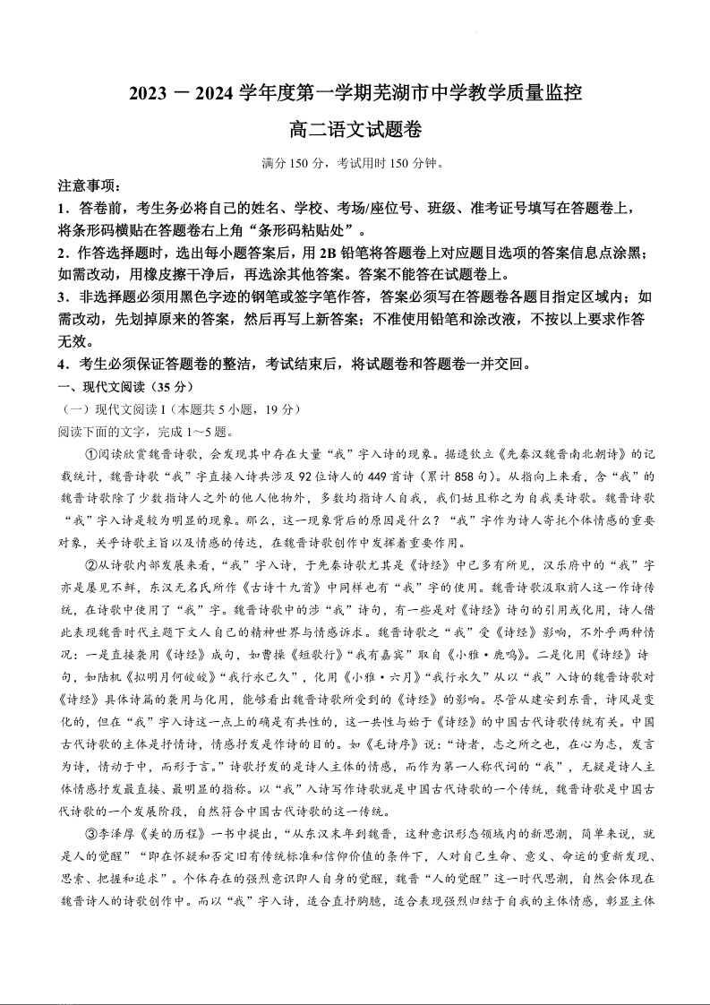 安徽省芜湖市2023-2024学年高二上学期期末考试语文+答案