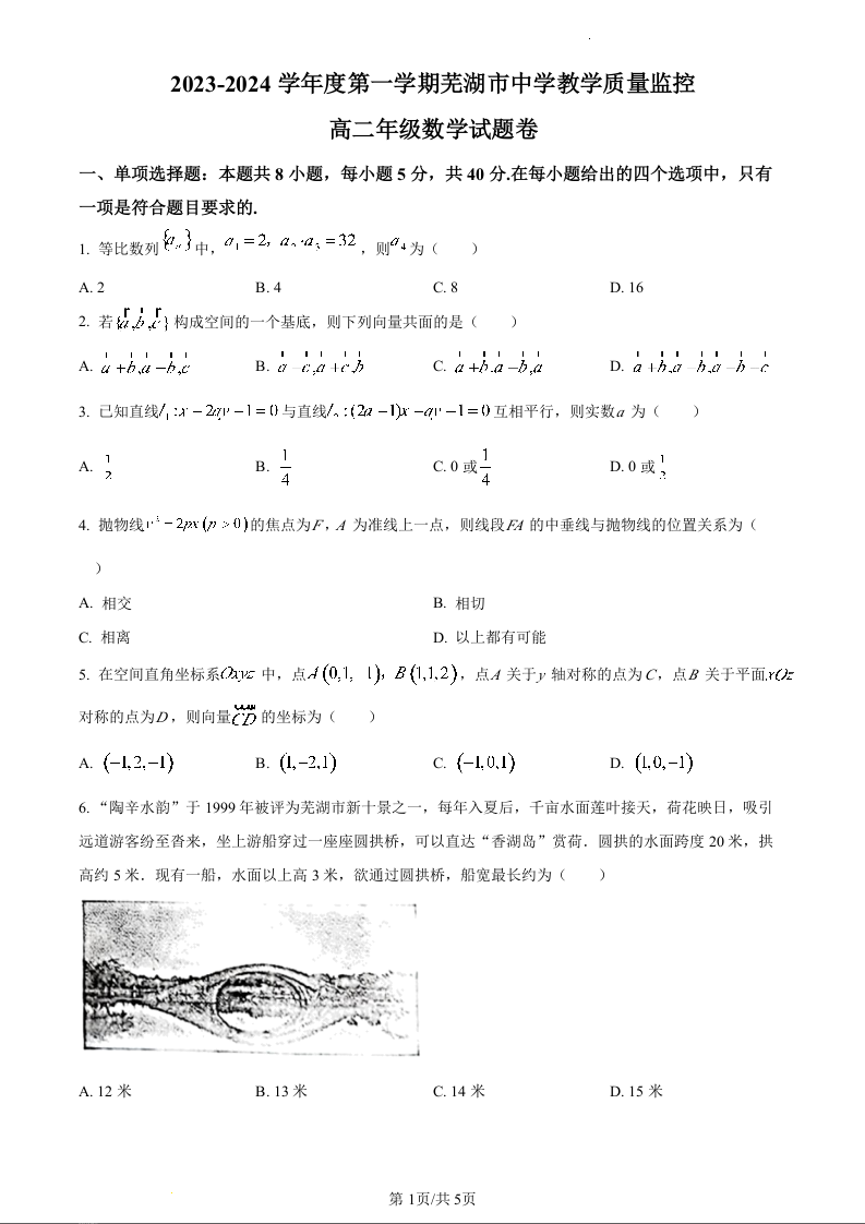 安徽省芜湖市2023-2024学年高二上学期期末考试数学(原卷版)