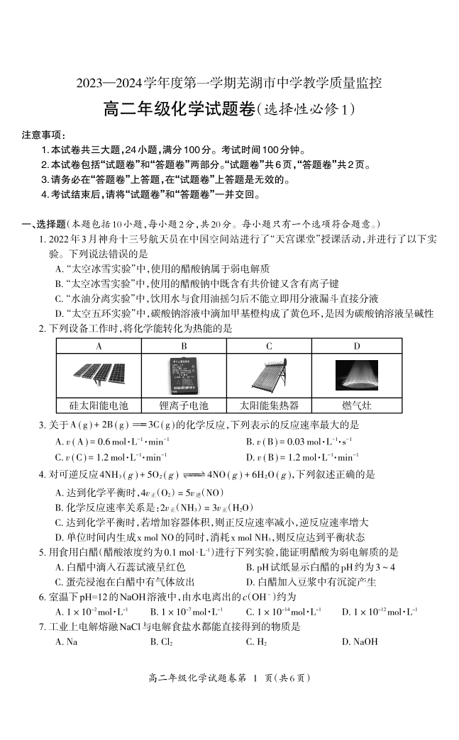 安徽省芜湖市2023-2024学年高二上学期期末考试化学