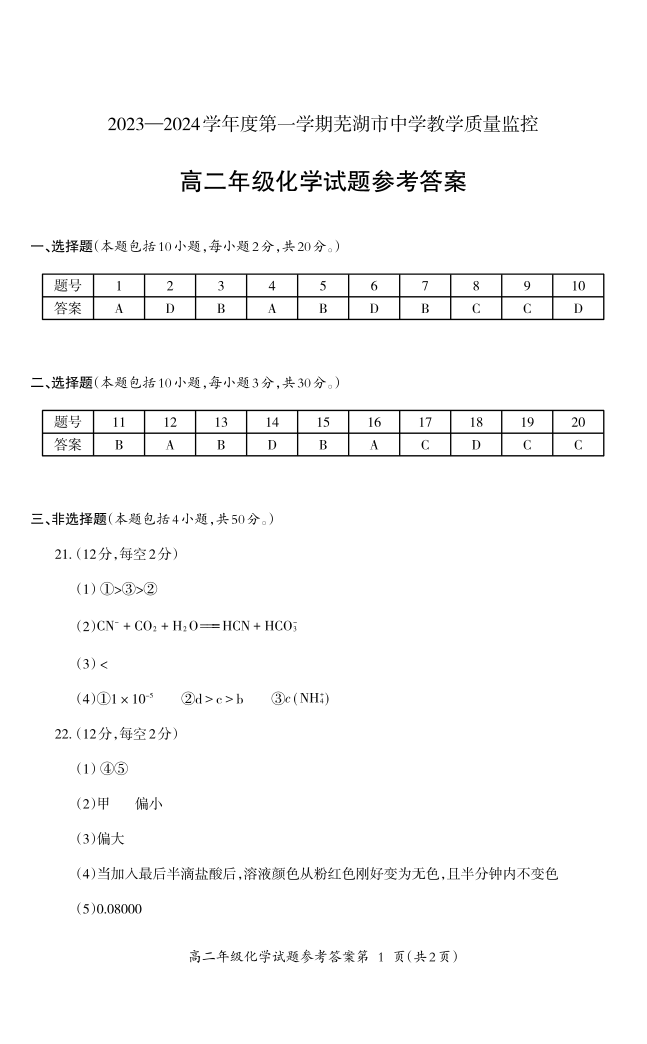 安徽省芜湖市2023-2024学年高二上学期期末考试化学答案