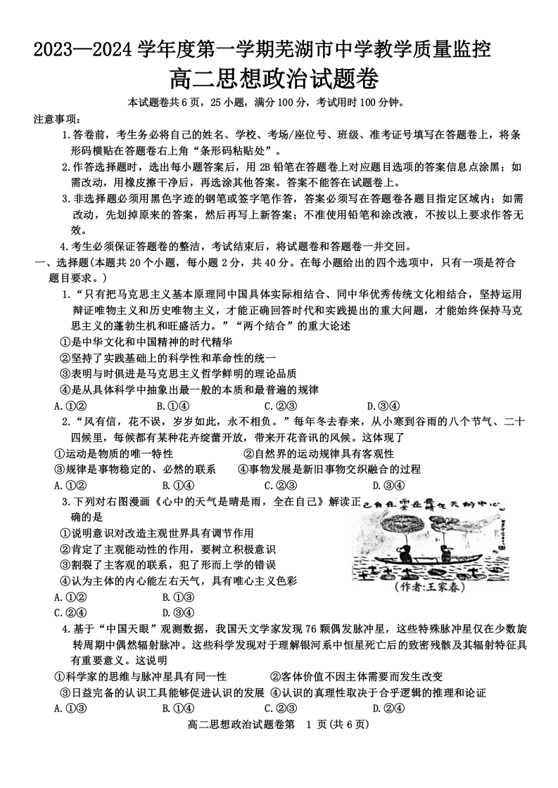 安徽省芜湖市2023-2024学年高二上学期期末考试政治