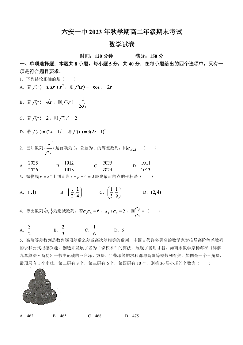 安徽省六安第一中学2023-2024学年高二上学期期末考试数学+答案