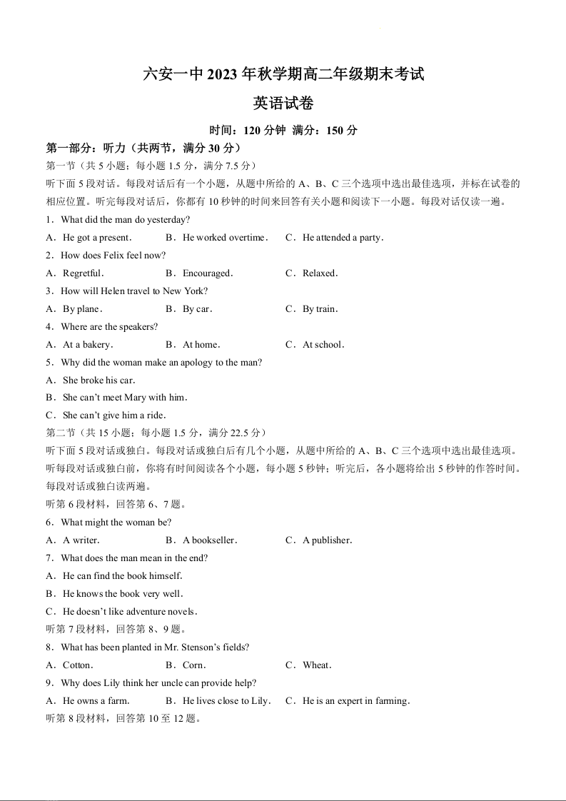 安徽省六安第一中学2023-2024学年高二上学期期末考试英语+答案