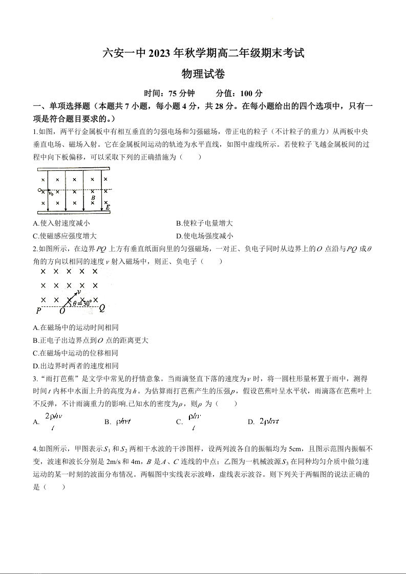 安徽省六安第一中学2023-2024学年高二上学期期末考试物理+答案