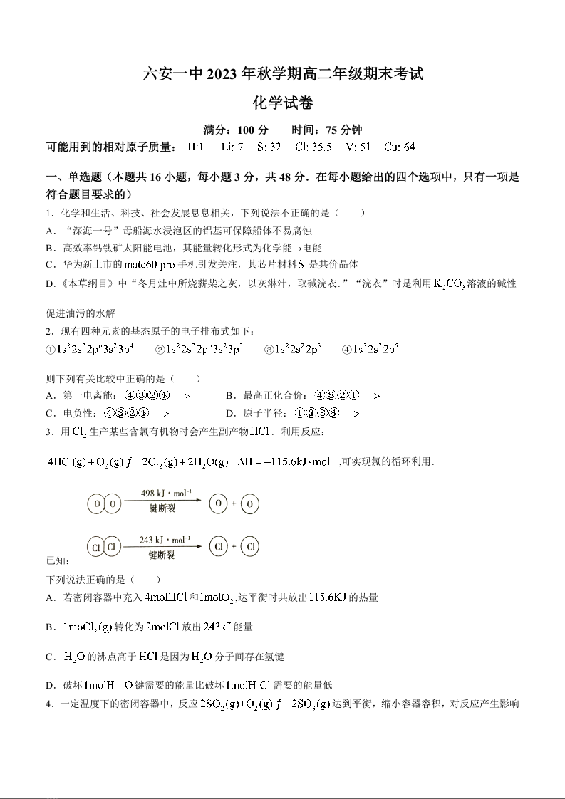 安徽省六安第一中学2023-2024学年高二上学期期末考试化学+答案