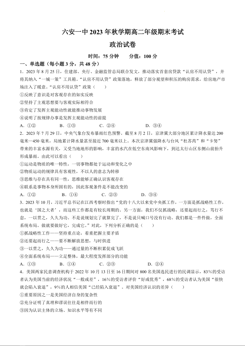 安徽省六安第一中学2023-2024学年高二上学期期末考试政治+答案