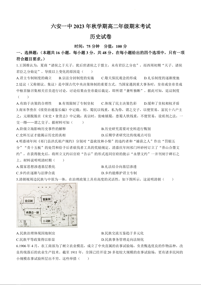 安徽省六安第一中学2023-2024学年高二上学期期末考试历史+答案