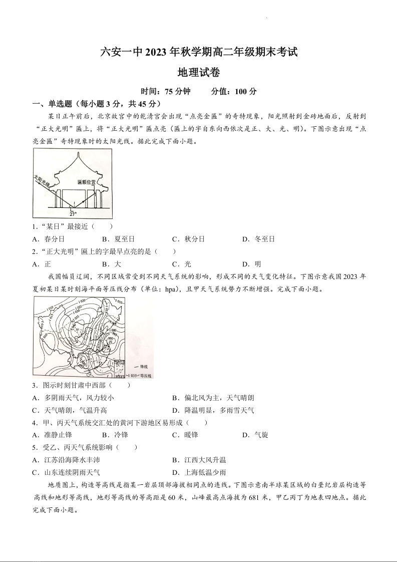安徽省六安第一中学2023-2024学年高二上学期期末考试地理+答案