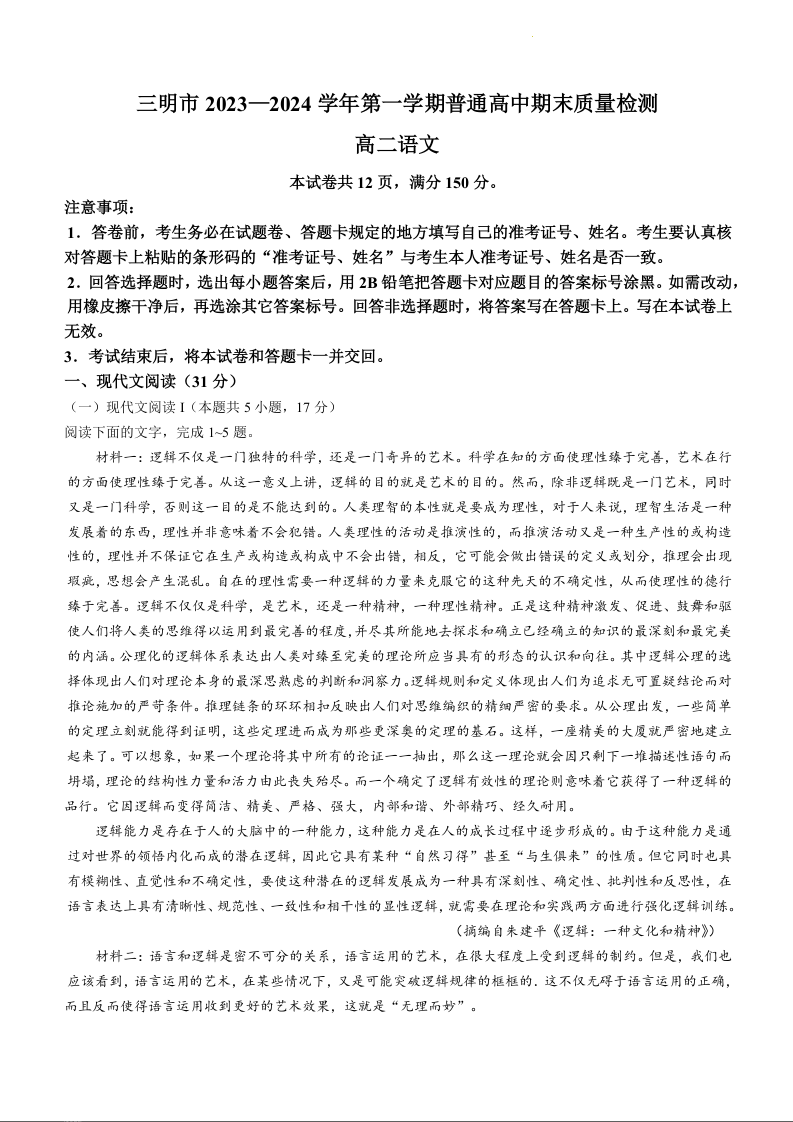 福建省三明市2023-2024学年高二上学期期末考试语文+答案