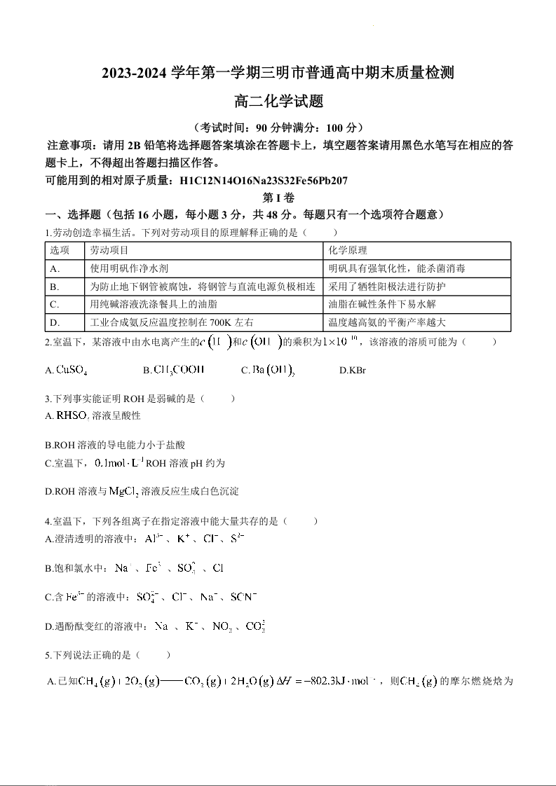 福建省三明市2023-2024学年高二上学期期末考试化学+答案