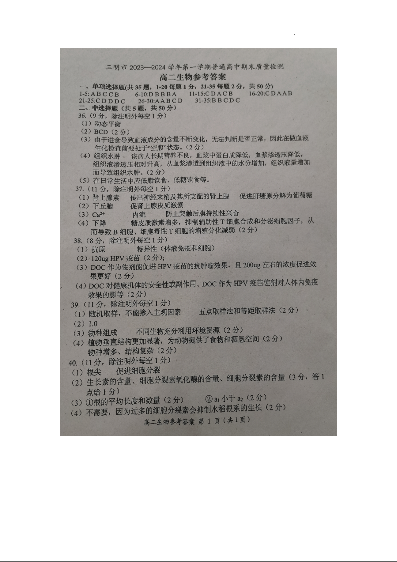 福建省三明市2023-2024学年高二上学期期末考试生物答案