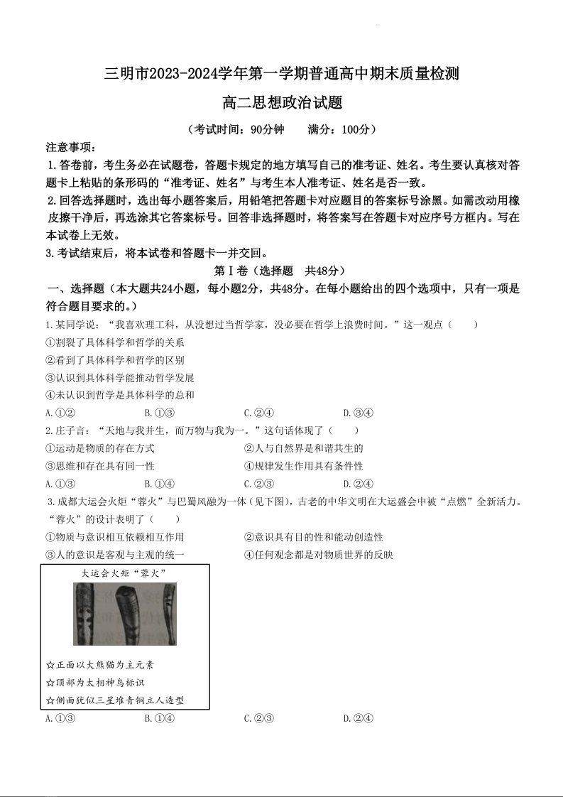 福建省三明市2023-2024学年高二上学期期末考试政治+答案