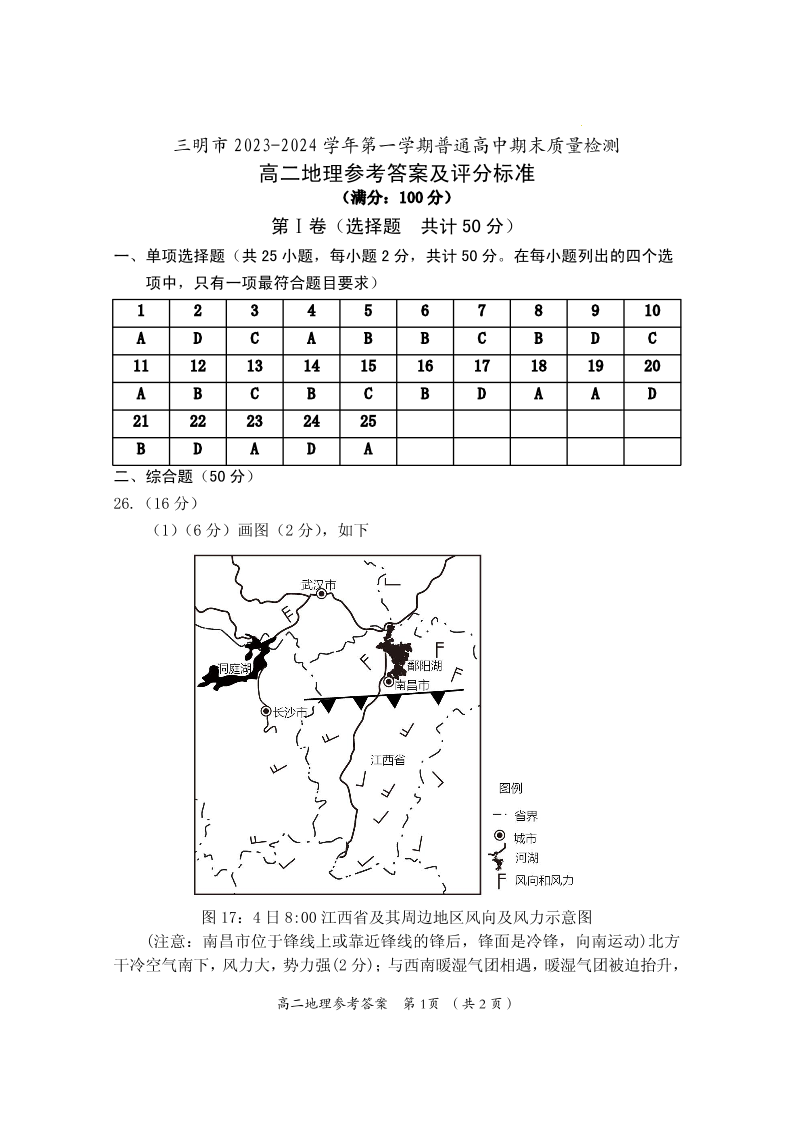 福建省三明市2023-2024学年高二上学期期末考试地理答案