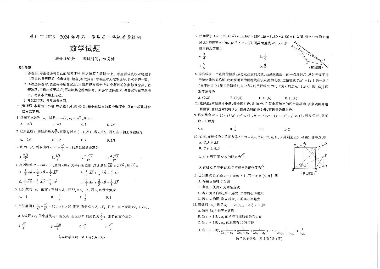 福建省厦门市2023-2024学年高二上学期期末考试数学