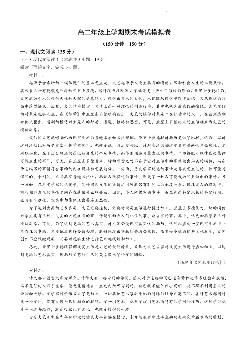 甘肃省白银市靖远县第四中学2023-2024学年高二上学期期末模拟考试语文+答案