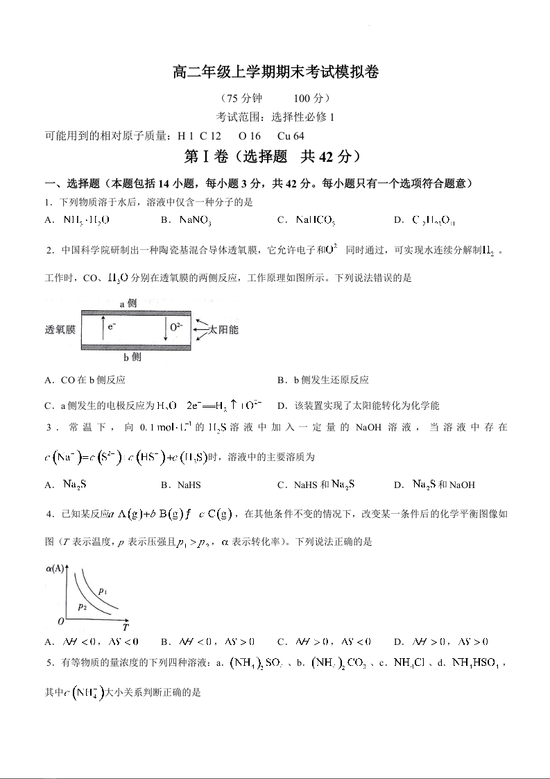 甘肃省白银市靖远县第四中学2023-2024学年高二上学期期末模拟考试化学+答案