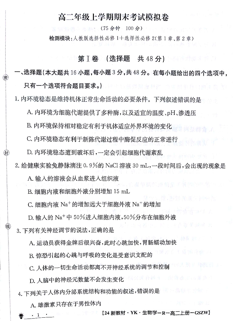 甘肃省白银市靖远县第四中学2023-2024学年高二上学期期末模拟考试生物