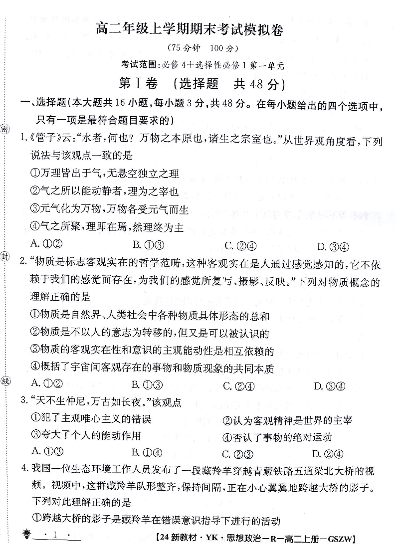 甘肃省白银市靖远县第四中学2023-2024学年高二上学期期末模拟考试政治