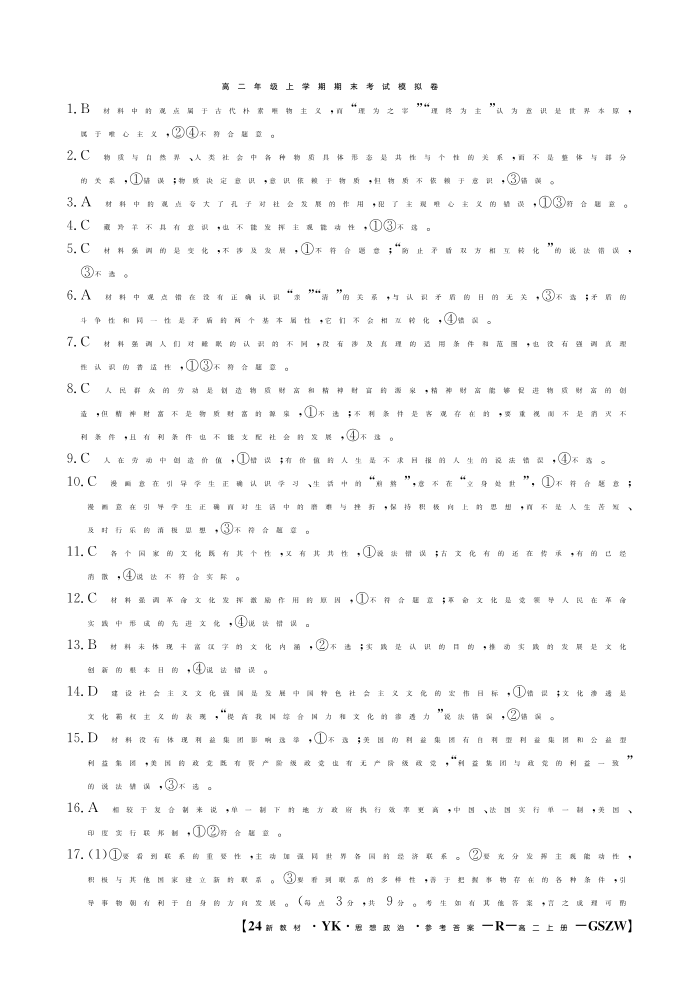 甘肃省白银市靖远县第四中学2023-2024学年高二上学期期末模拟考试政治答案