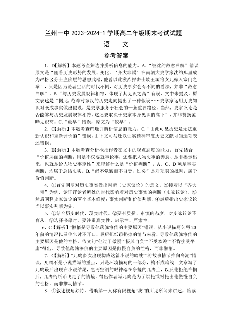 甘肃省兰州市城关区第一中学2023-2024学年高二上学期1月期末考试语文答案