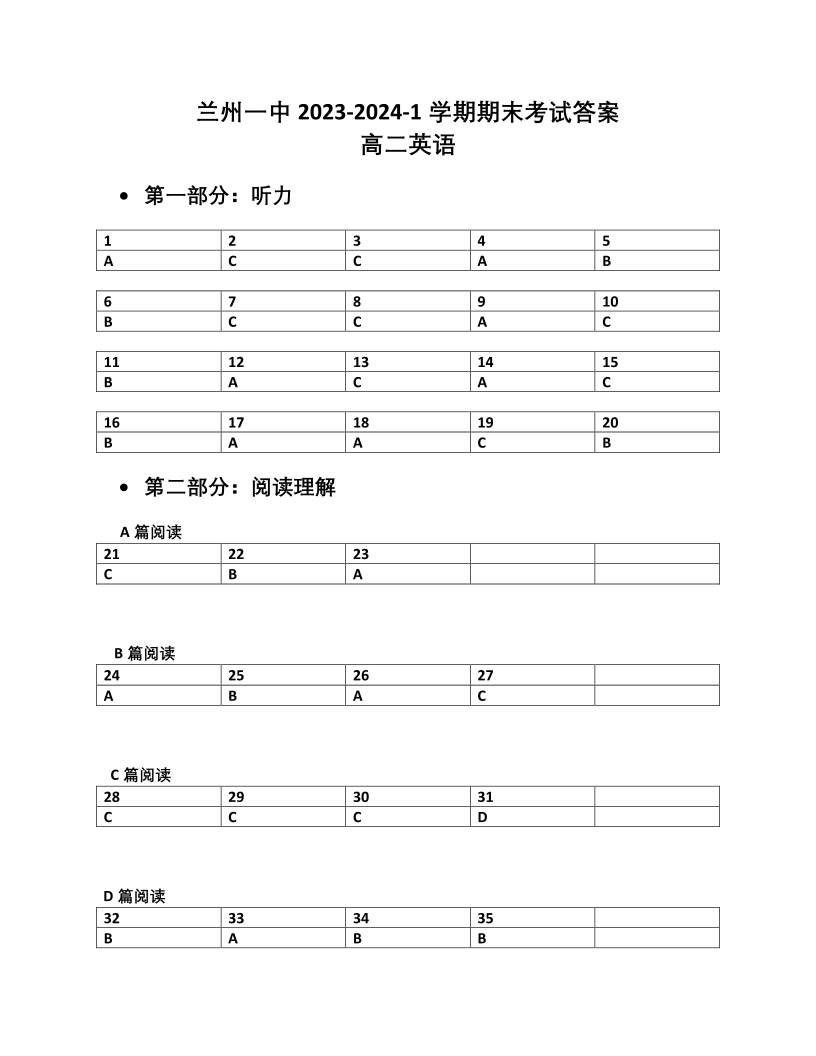 甘肃省兰州市城关区第一中学2023-2024学年高二上学期1月期末考试英语答案