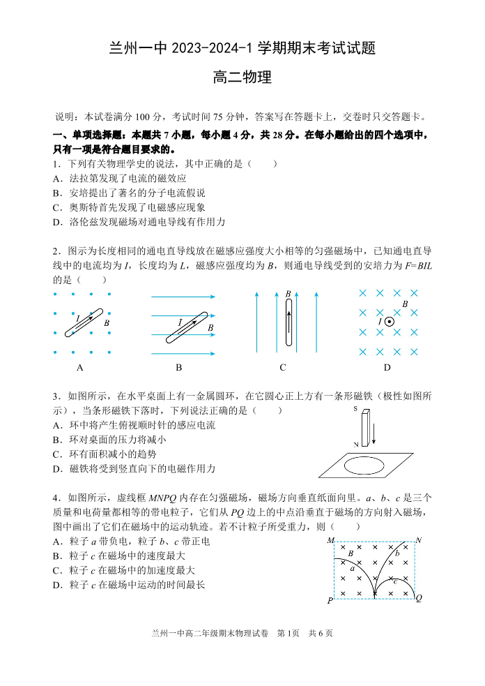 甘肃省兰州市城关区第一中学2023-2024学年高二上学期1月期末考试物理