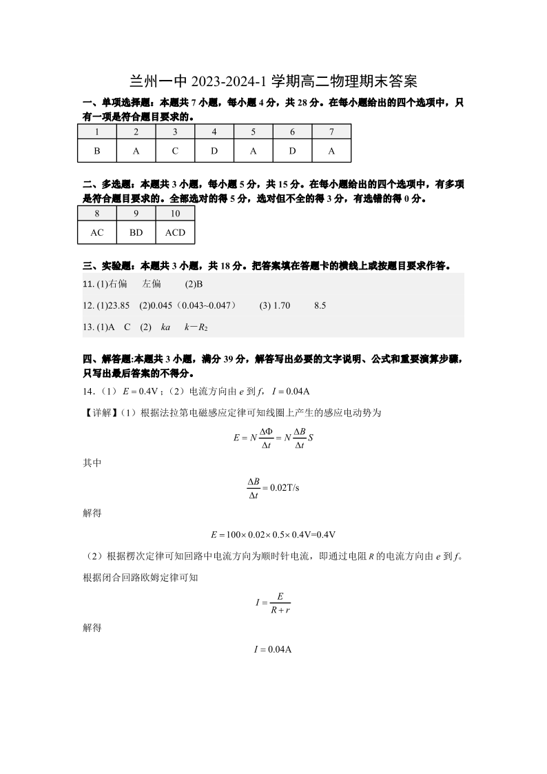 甘肃省兰州市城关区第一中学2023-2024学年高二上学期1月期末考试物理答案