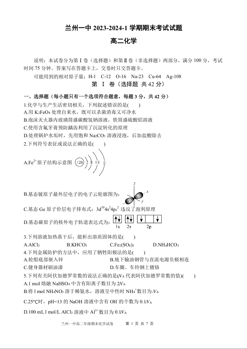 甘肃省兰州市城关区第一中学2023-2024学年高二上学期1月期末考试化学