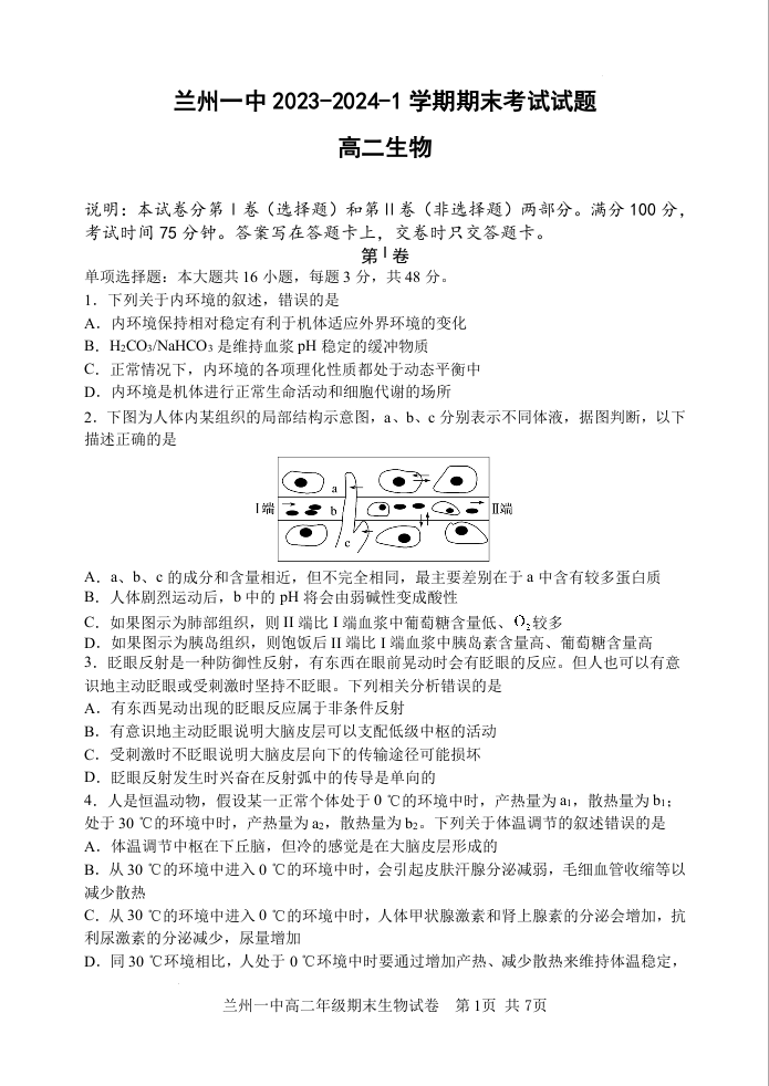 甘肃省兰州市城关区第一中学2023-2024学年高二上学期1月期末考试生物