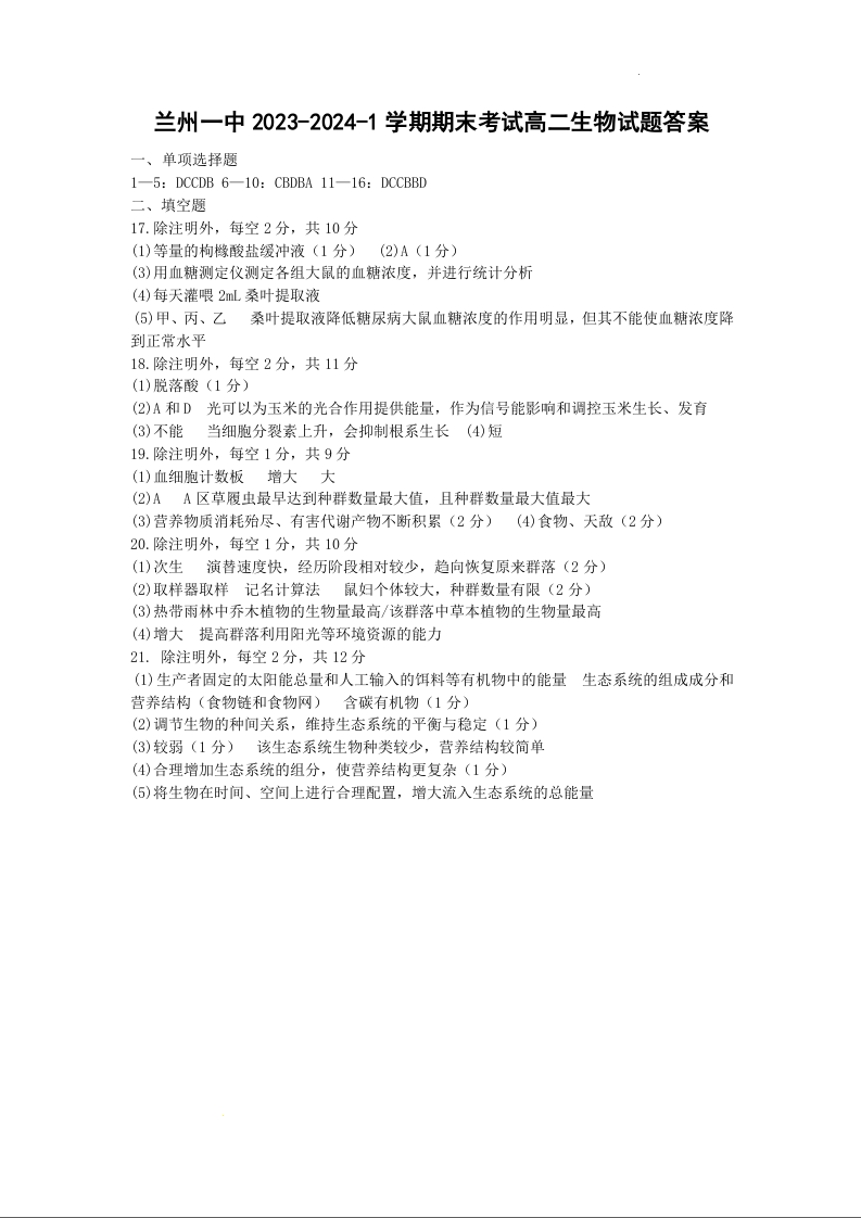甘肃省兰州市城关区第一中学2023-2024学年高二上学期1月期末考试生物答案