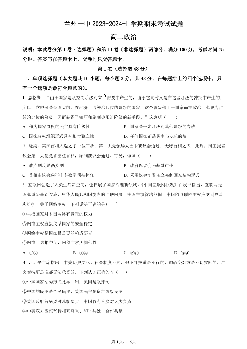 甘肃省兰州市城关区第一中学2023-2024学年高二上学期1月期末考试政治(原卷版)