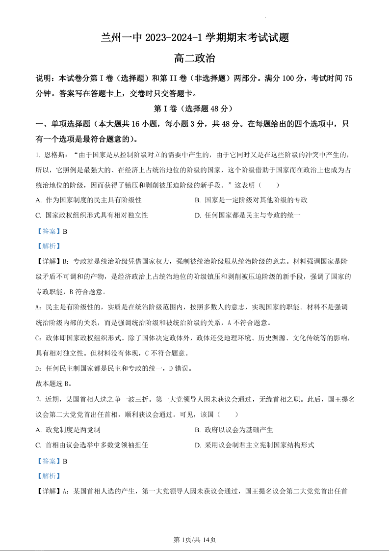 甘肃省兰州市城关区第一中学2023-2024学年高二上学期1月期末考试政治(精品解析版)