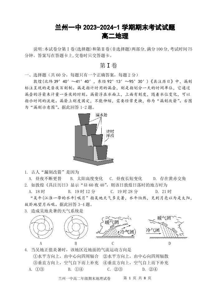 甘肃省兰州市城关区第一中学2023-2024学年高二上学期1月期末考试地理