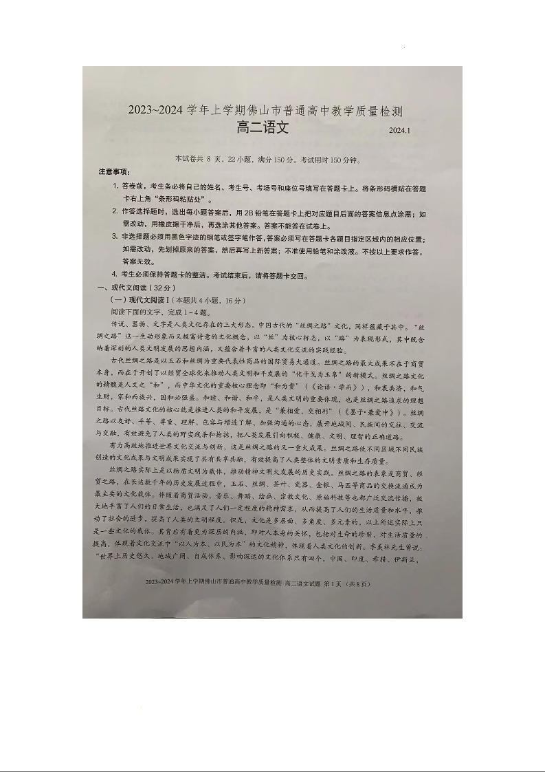 广东省佛山市2023-2024学年高二上学期期末教学质量检测语文