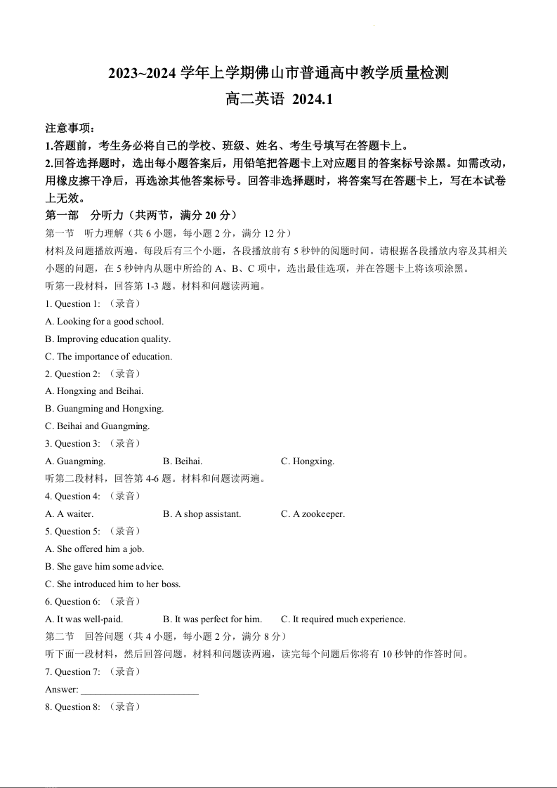 广东省佛山市2023-2024学年高二上学期期末教学质量检测英语