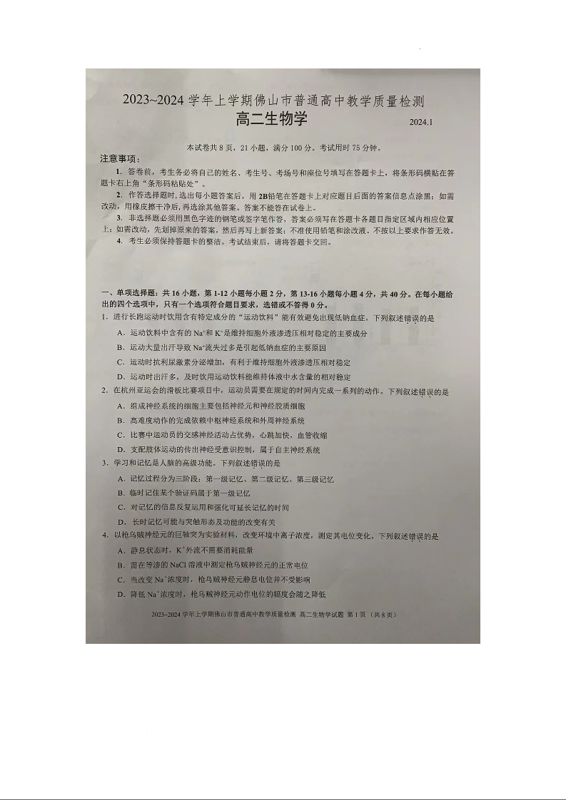 广东省佛山市2023-2024学年高二上学期期末教学质量检测生物